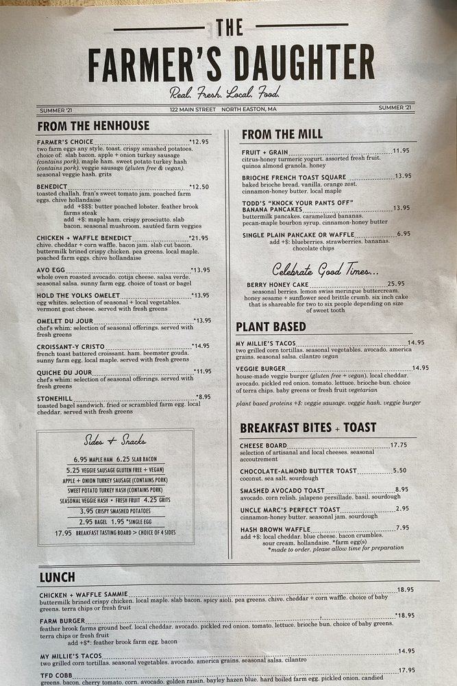 Welcome to The Farmer's Daughter, a charming American breakfast and brunch spot located at 122 Main St, North Easton, MA. This women-owned restaurant takes pride in its farm-to-table offerings, featuring locally sourced ingredients that elevate classic dishes. With a cozy farmhouse vibe and a welcoming atmosphere, it’s perfect for both casual outings and special occasions.